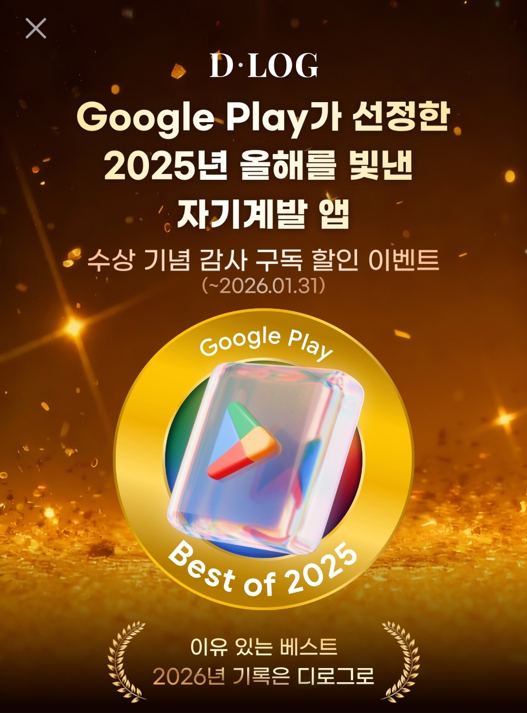 D.LOG가 어떤 어플인지는 몰랐지만, 구글플레이가 선정한 2025년 올해를 빛낸 자기계발 앱에 선정되었다고 떠서 설치 후 실제 사용까지 해보았다.