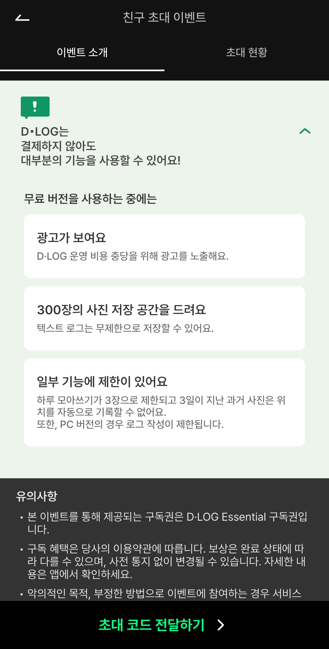 무료로 사용은 가능하지만, 일부 기능은 100% 쓸 수 없으니 조금 아쉬운 면이 있다(특히 사진 개수 제한이 아쉽다). 모든 기능을 다 활용하고 싶다면 유료로 구독하면 된다. 현재는 이벤트로 26년 1월 31일까지 1년 구독료 15,000원(정상가 18,000원)에 Essential(제한없는 모드)을 구독할 수 있다. 하지만 일단 어떤 기능들이 있는지, 나에게 이 어플이 맞는지 테스트도 해볼 기회가 있으니 친구초대 이벤트이다.